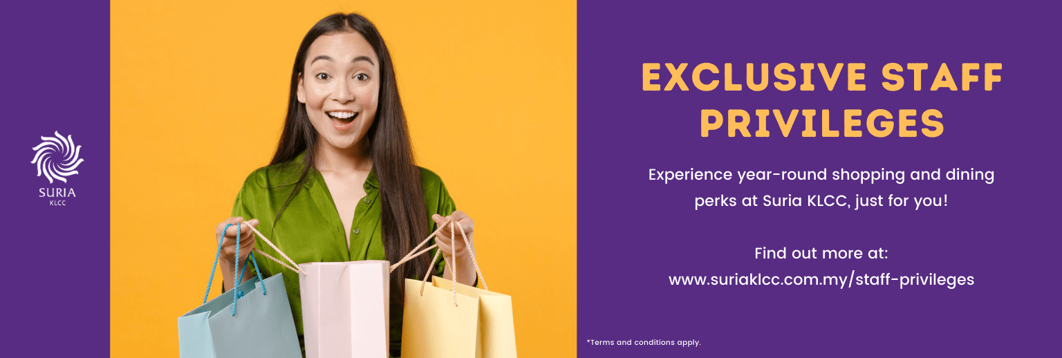 *Applicable only for employees of Suria KLCC, Maxis, PETRONAS, KLCC Holdings, Office Tenants in PETRONAS Twin Towers, and Menara 3 Building. *Subject to Terms and Conditions set by participating outlets.